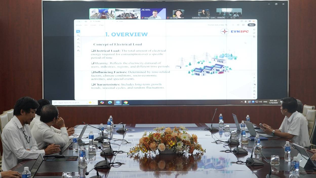 Sáng ngày 16/01, Tập đoàn Điện lực Việt Nam (EVN) vừa có buổi hội thảo trực tuyến với Trường Đại Học Adelaide của Úc về lĩnh vực “Ứng dụng AI trong chuyển dịch năng lượng và hiện đại hóa.”.Tại đầu cầu Tổng công ty Điện lực miền Nam (EVNSPC), Lãnh đạo EVNSPC và các đơn vị chuyên môn cùng tham dự.