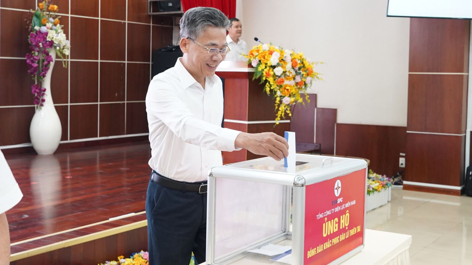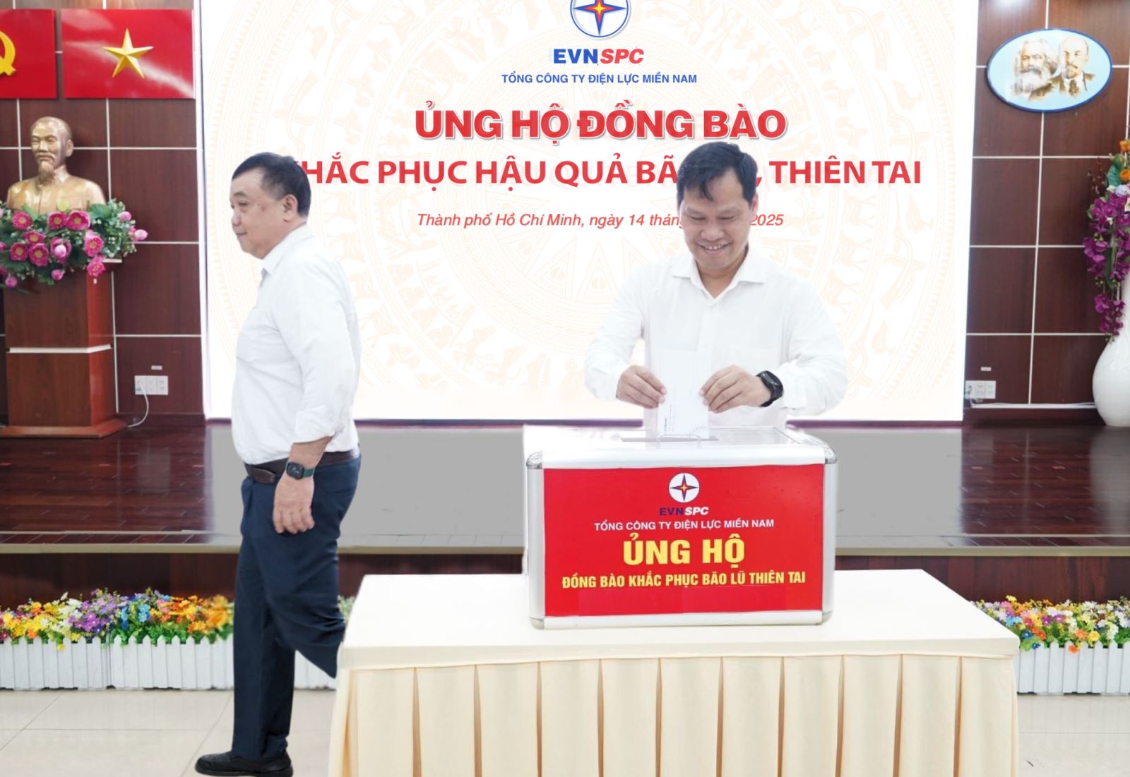 Sáng ngày 14/10, Tổng công ty Điện lực miền Nam (EVNSPC) tổ chức buổi quyên góp, ủng hộ đồng bào các tỉnh miền Bắc bị thiệt hại do bão lũ, thiên tai. Buổi quyên góp còn được thực hiện trực tuyến với sự tham gia từ Tổng công ty đến các đơn vị thành viên, cơ sở trực thuộc qua Hội nghị truyền hình, với tổng số gần 2.050 đại biểu là đoàn viên, người lao động của Cơ quan Tổng công ty, các đơn vị thành viên và đại biểu của Khóa đào tạo Giá bán lẻ điện hai thành phần được tổ chức trong dịp này.