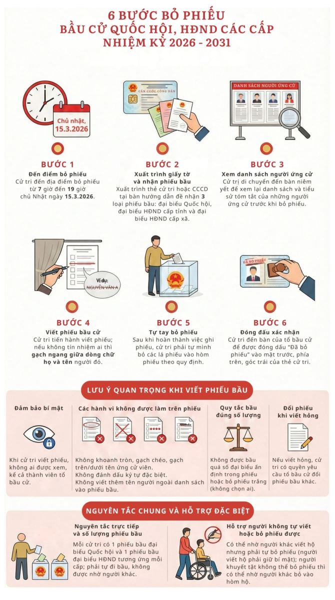 Việc bỏ phiếu bầu cử Quốc hội, HĐND được thực hiện theo 6 bước với các lưu ý cụ thể như sau: