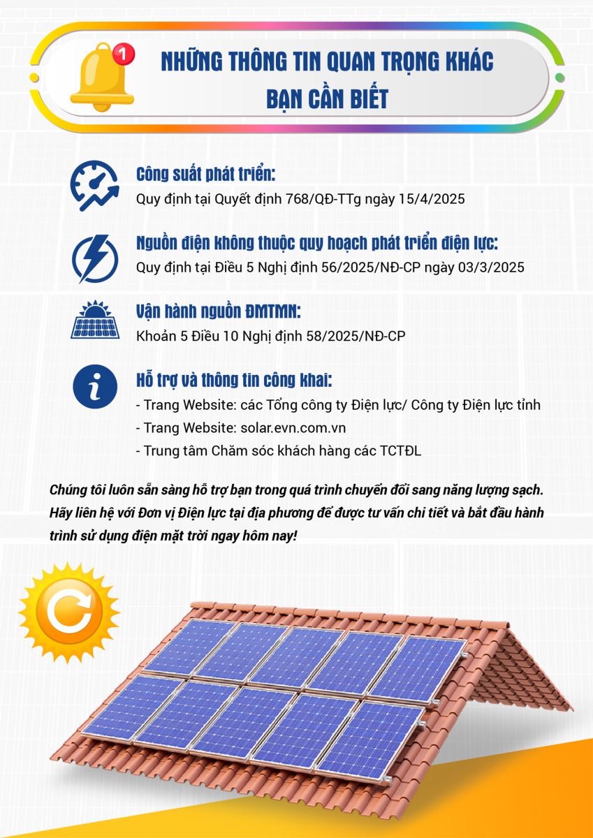 - QĐ 378: Quyết định số 378/QĐ-EVN ngày 12/3/2025 của Tập đoàn Điện lực Việt Nam về việc công bố Yêu cầu kỹ thuật kết nối nguồn điện mặt trời mái nhà tự sản xuất, tự tiêu thụ với Hệ thống thu thập, giám sát, điều khiển và Hệ thống dữ liệu đo đếm của Tập đoàn Điện lực Việt Nam theo Nghị định số 58/NĐ-CP ngày 03/3/2025 của Chính phủ.